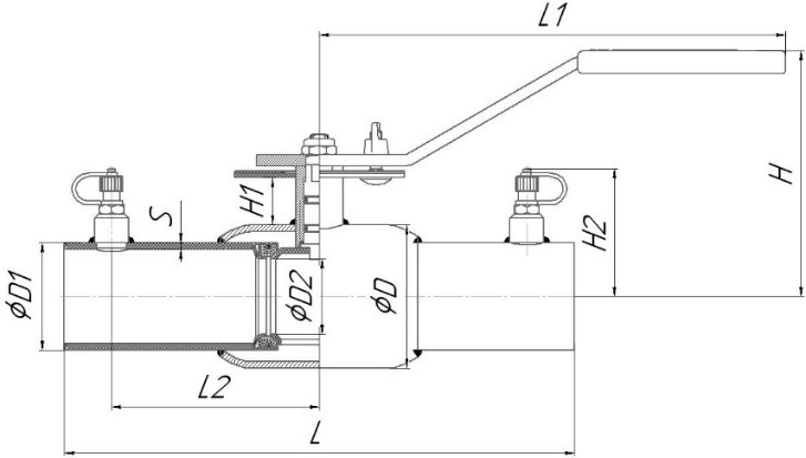 | Артикул | DN | PN | L | L1 | L2 | H | H1 | H2 | D | D1 | D2 | S | Вес без нипп | Вес с нипп | |